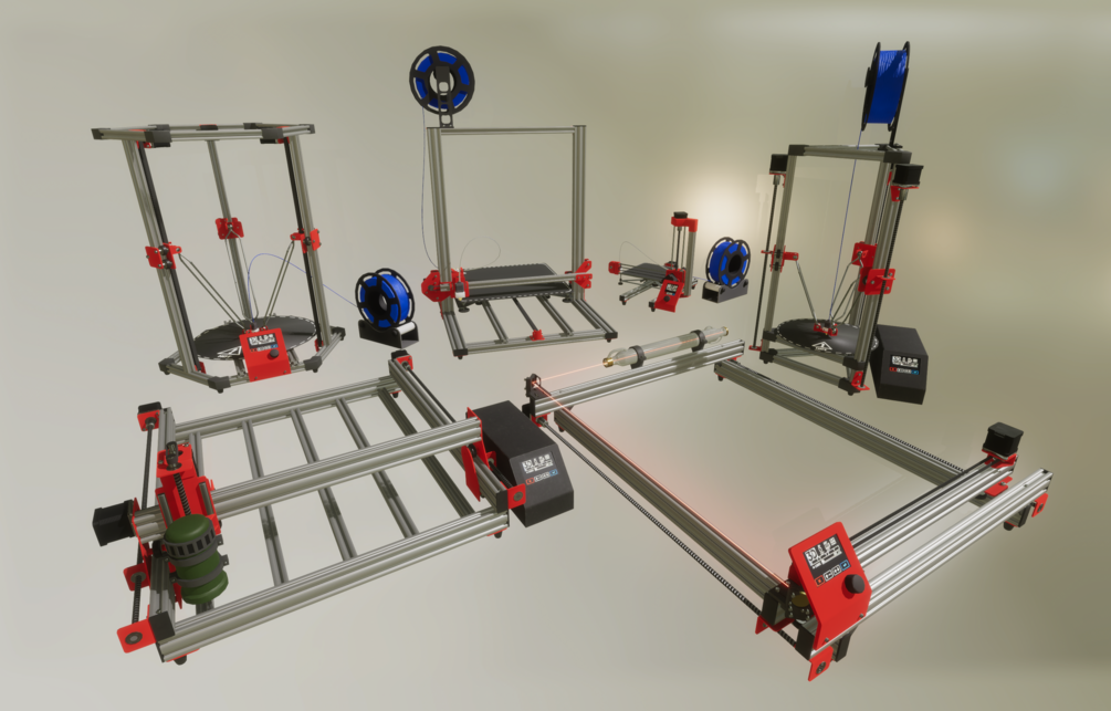 - 6 prefabs of full machines (2 catersian printers, 2 delta printers, 1 CNC Router, 1 C02 Laser Cutter)
